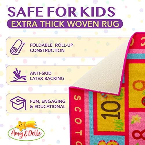 Bright and Colorful to Promote Imaginative PlaySET THE FOUNDATION FOR FUNRoll it out and get to playing! With this rug, your child will always have a reliable go-to area where they can play with their favorite toys and games. The hopscotch printed on the rug is super fun and consists of 10 numbers for your child to have all the fun they can have! Super colorful design will easily attract and stimulate your energetic youngers for hours!PERFECTLY SAFE MATERIALSafety is our priority and we make sure our rugs are upheld to the highest quality for your child to experience fun with no worries. Thick woven material makes sure your child can lay and stand on it without getting hurt. An anti-skid latex backing makes sure it doesn’t budge when your child runs across it and accidentally slips. Let your child’s imagination run free without worrying about if your child is near any harm! It’s perfect for any home, playroom, or daycare!Amy & Delle takes pride in creating fun and quality products for all children. Get this play rug for your child this holiday season or surprise them on their birthday so they can always have a fun space to themselves to play!