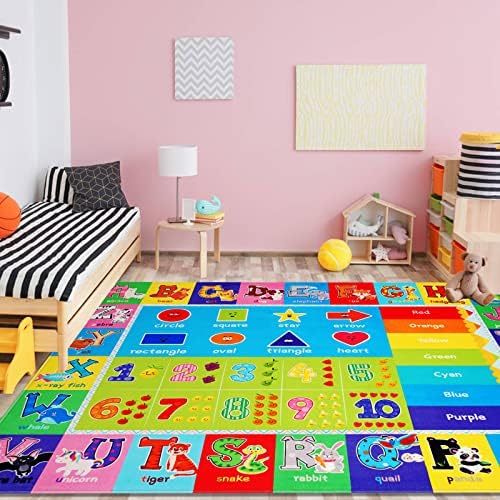 Kentaly Kids Baby Play MatOur kids play rug use soft and thick material, has 07cm thickness, and measure 787 x 59 inch, safer for kids playing, crawling, sitting, and movingOur kid’s rugs feature various elements including alphabet animals numbers colors shapes, bright colors, vivid patterns great for kids to explore and learnHigh resilience, anti-wrinkle, non-slip bottom design to prevent your child from getting injured by slippingLearn Alphabet AnimalsThis kids carpet combination design vivid and specific cartoon animal patterns with letters, It helps kids learn while playingLearn ShapeEach shape is designed with different colors, help your children learn to sort and match shapes and colorsLearn NumbersIn order for to kids better understand the numbers, this educational rug designs numbers corresponding to fruits, creating even more opportunities for learning